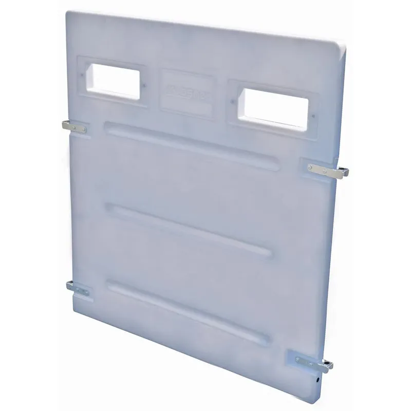 - 2 ouvertures pour en faciliter la manipulation et permettre au veau, dans le cas de cases montées en dos à dos, de pouvoir rester en contact et ce au dessus de 900 mm du sol, conformément aux réglementations Européennes et conseils de la Chambre d’Agriculture.